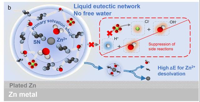 Schematic diagrams of Zn2+ solvation structure and interfacial reactions in (a) traditional aqueous electrolyte and (b) hydrated eutectic electrolyte. Credit: Zhao Jingwen and Yang Wuhai