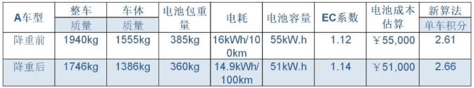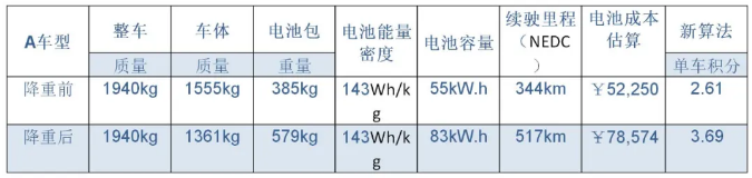 2)车辆降重10%,保持原车型续航里程不变,通过分析得知电耗降低1.1kWh/100km,动力性提升。假设电池能量密度不变,计算结果为: