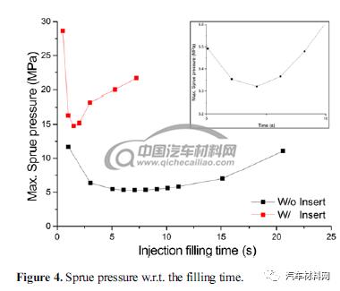 填充型腔所需的浇口压力与填充时间的函数如图4所示。高聚物熔体需要较高的注射压力才能填充模具型腔,并且需要较高的浇道压力才能缩短填充时间。最佳填充时间是浇口压力相对于填充时间在图中的最低点,由图可分析得,带嵌件的最佳时间为1.5s,不带嵌件的最佳时间为7s。通过模拟还可以预测浇口处的冻结时间。不带嵌件和带嵌件的保压时间分别为70s和55s(图5)。铝嵌件的初始温度设置为80℃,冷却时间为900s。