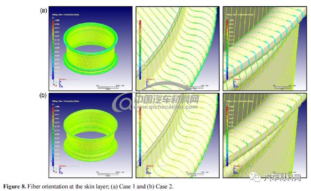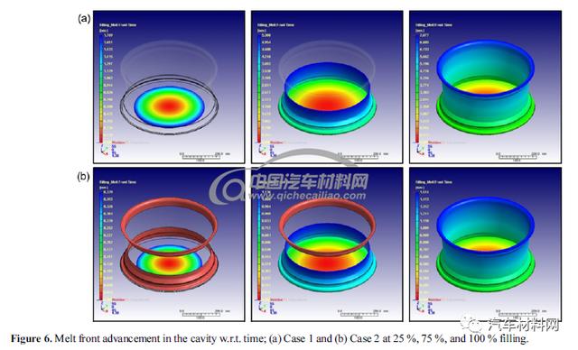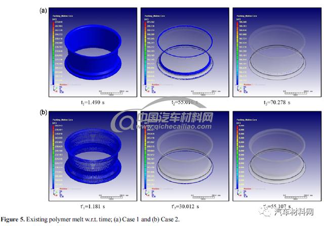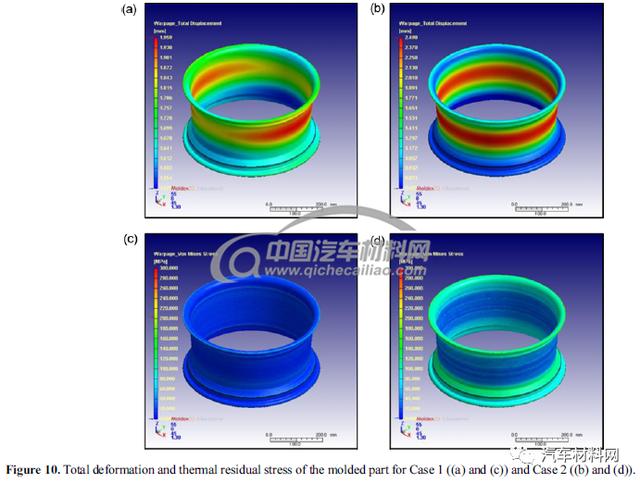 成型零件的总变形和热残余应力如图10所示。对于案例1,随着与浇口的距离变大,变形增加(图10(a))。在案例2中发现,在嵌件的插入部分所在的上部和下部位置,变形明显减小了(图10(b)),但是中间的变形增加到2mm。另一方面,案例2的残余应力高于案例1,特别是在中部地区。因此,带有嵌件的轮辋在变形方面获得了显著的改善。