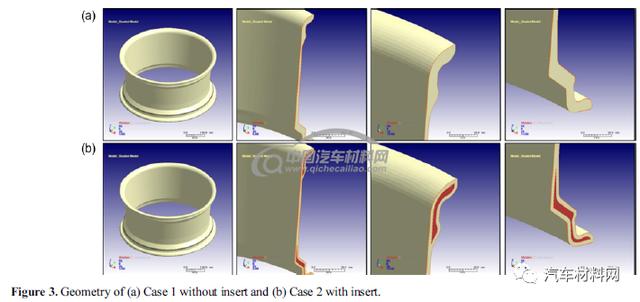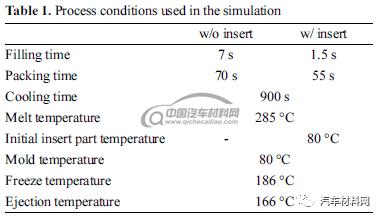 对于数值模拟,考虑了两种情况:没有嵌件和带有金属嵌件。如图3(b)所示,金属嵌件位于汽车车轮的上部和下部。模拟中采用40wt%碳纤维填充聚酰胺6(PA6)(Akro-plastic Corporation(AKROMID B3 ICF 40))和铝嵌件。用于数值分析的材料属性是从Moldex3D获得的,处理条件见表1。