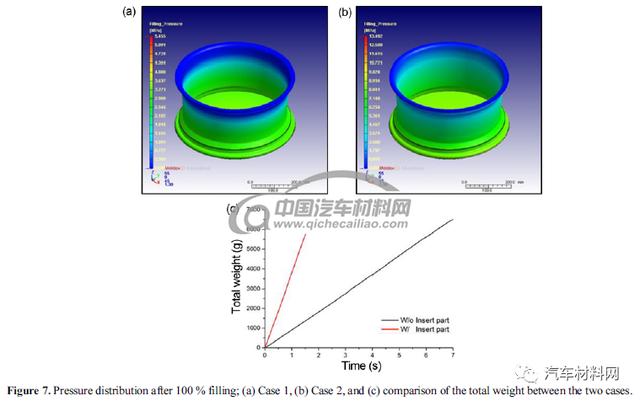 图6示出了熔体在型腔中相对于时间的位移情况。树脂首先填充圆形流道,然后注入腔中。案例1的填充时间为7.077s,案例2的填充时间为1.514s。案例2需要更高的压力,因为其填充时间比案例1的短。因此,案例2的压力场高于案例1。案例2的总重量高于案例1(图7(c)),因为铝的密度(2.7×103kg/m3)高于聚合物的密度(1.31×103kg/m3)。
