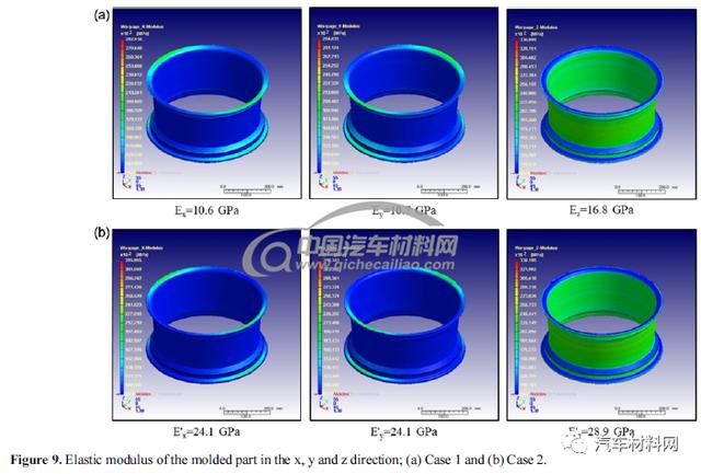 图8预测了纤维的取向。由于树脂主要沿垂直方向流动,因此在两种情况下纤维都沿该方向。并且带和不带金属嵌件的两种方案纤维取向非常相似。图9示出了模型部件在x、y和z方向上的弹性模量。图中给出了每个方向上的平均模量,带铝嵌件的部件在各个方向上均显示出较高的值。铝的模量为68GPa,碳纤维的弹性模量在纵向为38.2GPa,横向为10.3GPa。对于这两种情况,由于纤维取向的原因,z方向的模量均高于x和y方向的模量。
