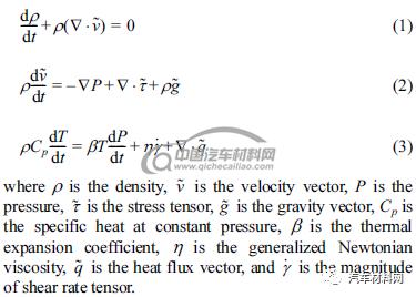 本研究针对碳纤维复合材料车轮的注塑成型工艺,使用有限元法(FEM)Moldex3D®模拟,对整个工艺步骤(注塑、保压、冷却和顶出)进行了建模。模具中的树脂流动受以下方程式如下: