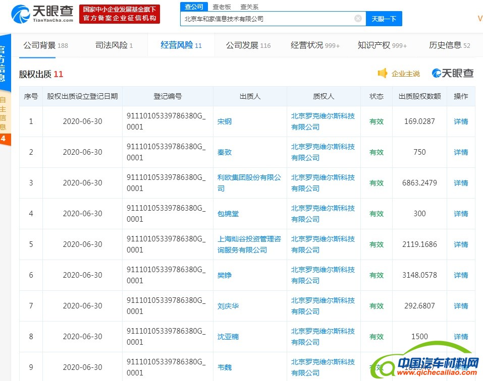 7月6日,记者在天眼查上发现,理想汽车的运营主体北京车和家信息技术有限公司(以下简称车和家)新增11条股权出质信息,11位股东全部出质股权,质权人为北京罗克维尔斯科技有限公司(以下简称罗克维尔斯)。