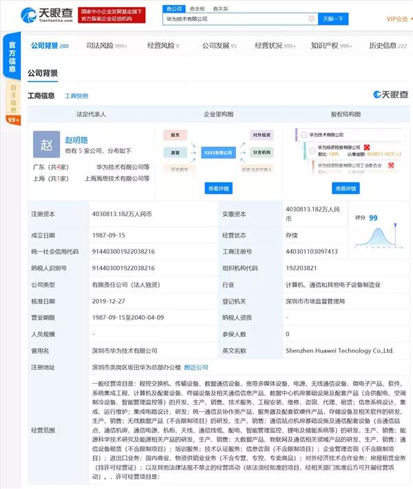 华为技术有限公司成立于1987年9月,法定代表人为赵明路,注册资本约403.08亿人民币,公司经营范围包括一般经营项目是:程控交换机、传输设备、数据通信设备、宽带多媒体设备、电源、无线通信设备、微电子产品、软件、系统集成工程、计算机及配套设备等。该公司由华为投资控股有限公司全资持股。