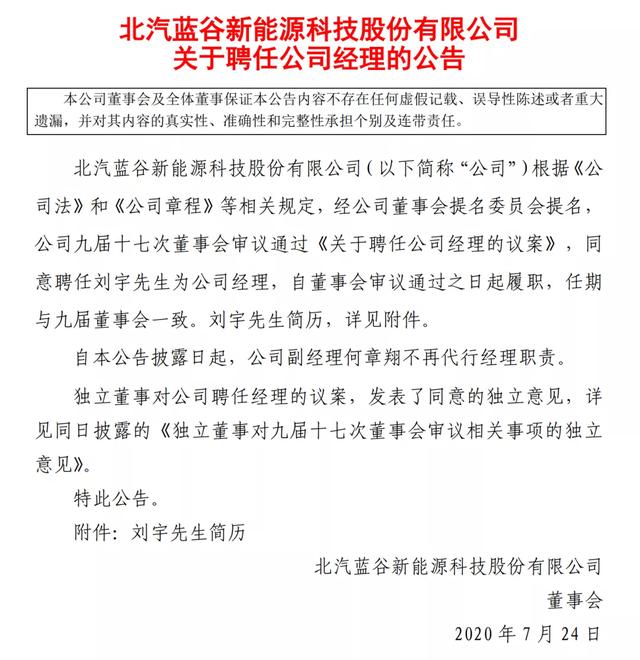 【中国汽车材料网讯】北汽新能源迎来新领导,刘宇出任经理一职。7月24日北汽蓝谷发布公告,经公司董事会提名委员会提名,同意聘任刘宇先生为公司经理,自董事会审议通过之日起履职。