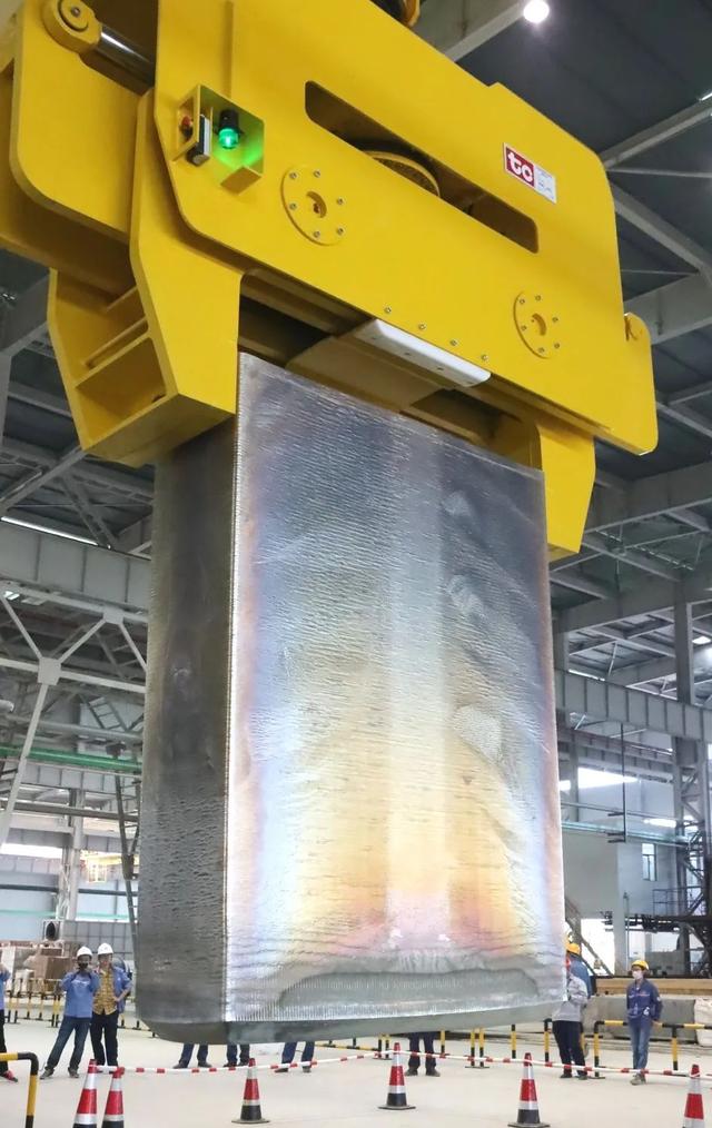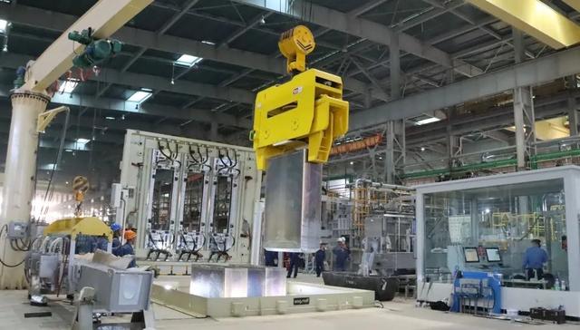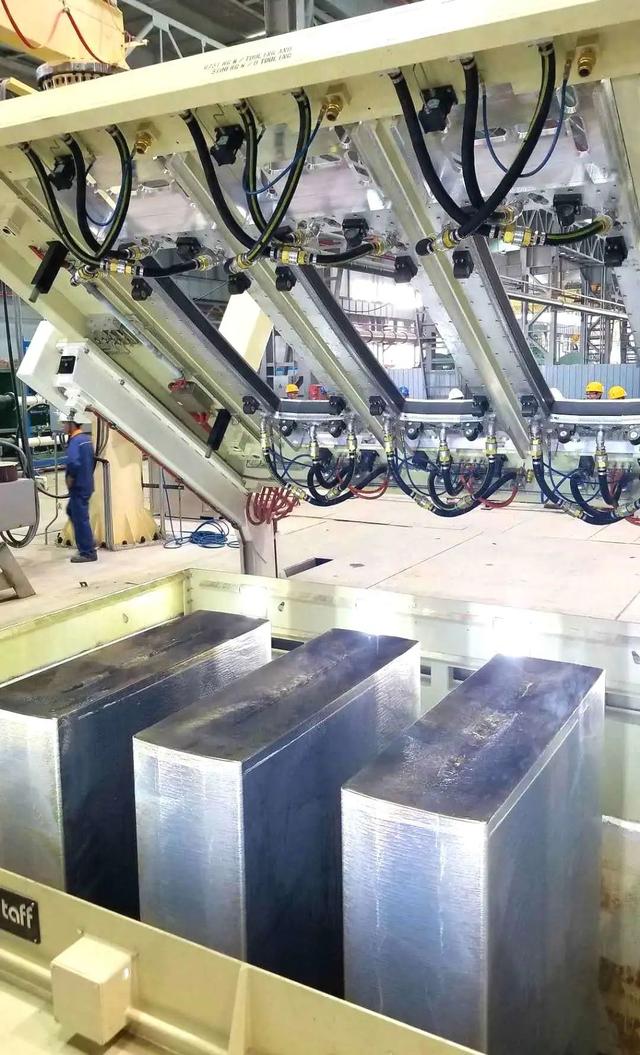 第一块铝扁锭被吊具夹起↑