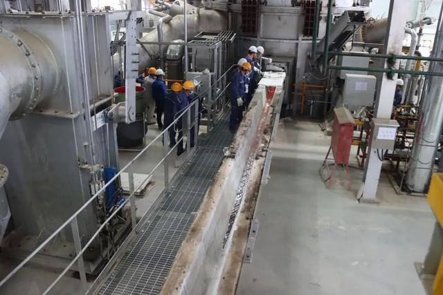 自7月29日23点30分,第一批18吨铝锭加入熔炼炉中,经过二次加料,升温,扒渣,搅拌等工艺环节,30日11点15分铝液经流槽倒至保温炉,于17点10分开始铸造过程。历时18个半小时,从铸造机中产出宝武铝业的第一块铝扁锭,熔铸产线热负荷试车取得圆满成功。