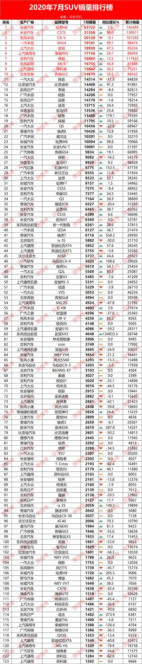2020年7月SUV销量排行榜