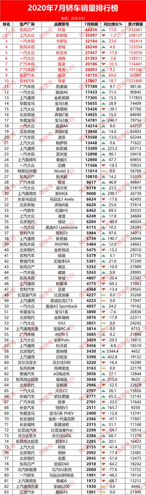 2020年7月轿车销量排行榜