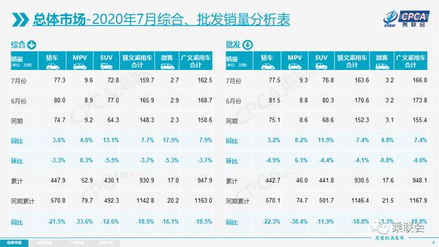 【汽车材料网】零售:7月乘用车市场零售达到159.7万辆,同比去年7月增长7.7%,实现了自2018年5月以来的最强正增长。20年1-7月的全国乘用车市场累计零售930.9万辆,零售同比累计下降18.5%,较1-6月累计增速提升4个百分点。今年累计销量同比少销212万辆,约占去年全年零售总量10个百分点,今年零售下降主要是受到春节偏早和疫情因素,对一季度影响208万辆,二季度零售同比损失只有17万辆,三季度的开局7月出现增量12万辆,体现出行业快速回暖的态势。