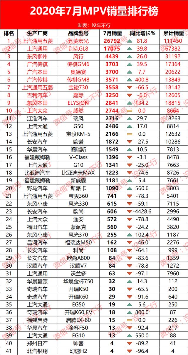 2020年7月MPV销量排行榜