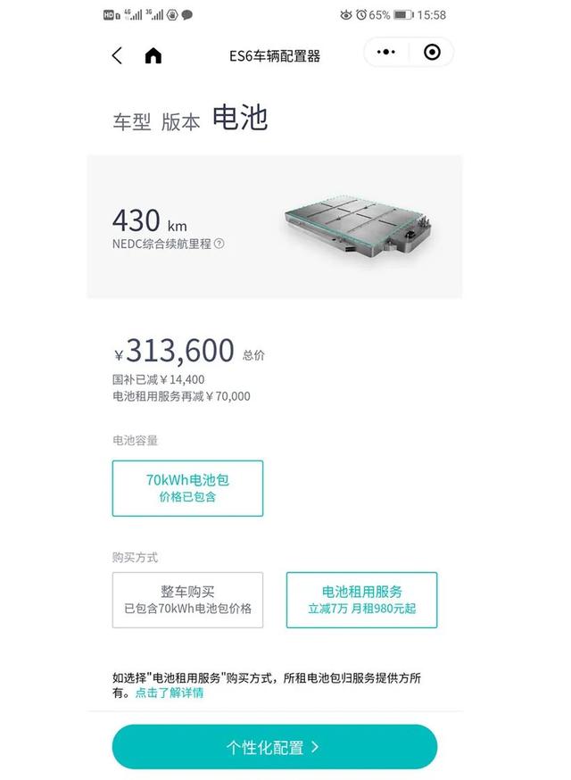 从蔚来官方小程序看到,BaaS电池租用服务已经正式上线,以电池包为70kWh的ES6性能版为例,补贴前其售价为39.8万,国家补贴为1.44万元,并免除了购置税,选择BaaS租用服务的用户车价立减7万元,那么购买车辆的价格为31.36万元。按照30%的首付来计算,首付为94080元,贷款3年,费率为2.99%,则月供为6645元。如果首付为15%的话,月供将会更低,用户可自行选择。