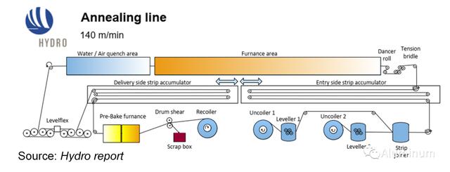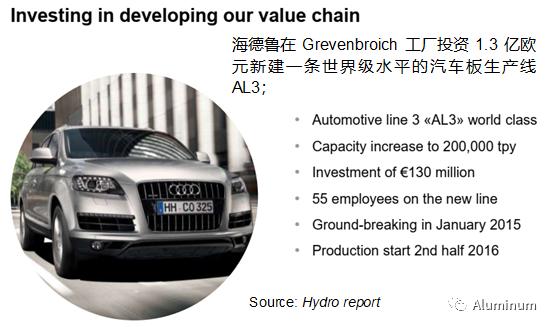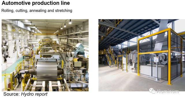 海德鲁坐拥全球最大铝合金轧制厂——德国 Alunorf 厂50%股份, Alunorf 厂两条热轧生产线综合产能约为 170万吨/年,冷轧产能约为 130万吨/年。但整个海德鲁的汽车车身板产能却只有20万吨,主要原因在于车身用铝合金板的生产工艺流程长,熔铸热轧冷轧产能一般都较大,车身板产能主要受限于连续退火线和表面处理线。海德鲁在2014年投资1.3亿欧元在德国 Grevenbroich 工厂新建一条世界级水平的汽车车身板生产线,这条线已在2016年下半年完工并投产,这条线提升了德国 Grevenbroich 工厂的连退线产能,进而将整个海德鲁的汽车车身板产能从 5 万吨/年提升至 20万吨/年。但海德鲁汽车用铝材的供货能力达 100万吨/年,包括车身板、换热器用铝板、挤压型材、铸造铝合金等。