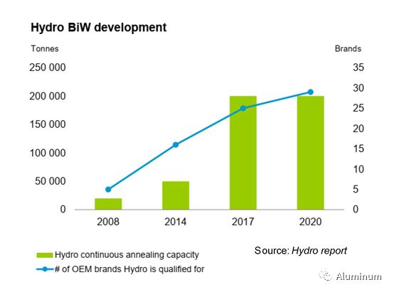 海德鲁的一份报告显示,2020年海德鲁已将汽车车身板产能提升至20万吨/年。相比于诺贝丽斯(Novelis) 100万吨/年 的汽车板产能,海德鲁20万吨/年的产能算是比较小的,但还要考虑到现在全球汽车板市场也就200多万吨/年的容量。