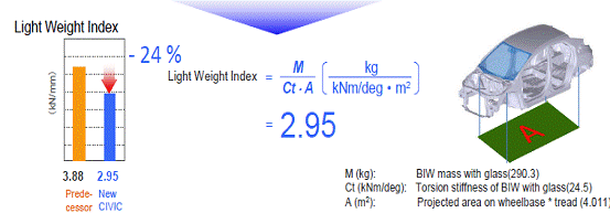 该车的轻量化系数为比上一代产品轻量化系数降低24%,但其车身重量比上一代增加了0.7%。尺寸方面,轴距增加了30mm,轮距减小30mm,整个脚印面积减小0.8%。通过测算,得到上一代CIVIC的扭转刚度为18.8K Nm/°。由此可见,新CIVIC的车身轻量化系数的降低主要得益于扭转刚度的提高。在宝马3用材解析中已经分析过,车身性能的提高无疑是应该鼓励的,但是一味追求车身的某个性能指标,而整体重量未得到有效控制,这样的结果似乎还是存在一点遗憾的。然而性能提高的指标主要集中在与车身轻量化评价系数相关的扭转刚度(当然部分车型的安全性还是有显著提高的)上,的确耐人寻味。要求汽车产品性能有大幅提升,同时又要降低重量,似乎太过苛刻。但是随着汽车技术的发展,车身的性能(刚度、模态、安全性等等)差距越来越小,那时的重点应该就是在减小绝对重量上下功夫了。