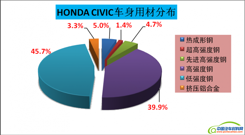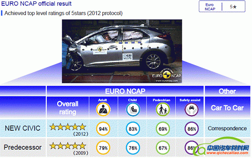 图4资料显示,CIVIC白车身的高强度钢比例为51%,作为一款轿车,用材并无多大亮点。国内很多在研车型已经超过这个比例(高强度钢分类的差异已在宝马3用材解析中做过详细分析),并不高的刚强度钢用量,却达到了欧洲五星的安全性能,这也体现日系车一贯的特点:性能不是靠材料体现的,而是靠精确的,面向法规的设计能力。根据相关BM分析结果显示,在08年之前国内销售的日系车,高强度钢的用量非常少,但是通过结构的优化设计来满足国内的安全法规要求,甚至有些车型达到了C-NCAP五星。