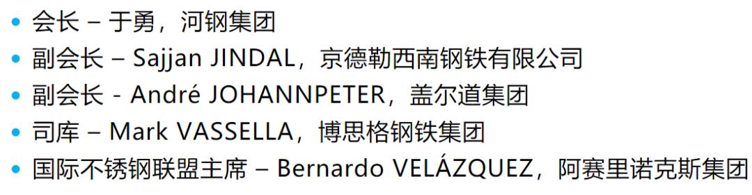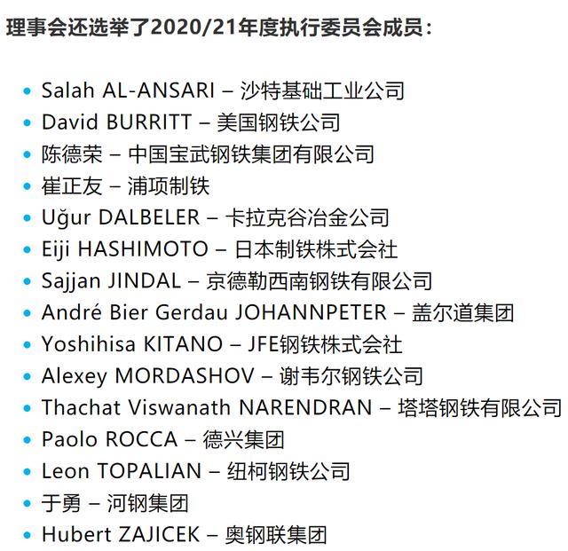 会上世界钢铁协会理事会选举产生了2020/2021年度执行理事会成员。执行理事会的理事任期通常为一年,但由于新冠肺炎疫情导致协会年度会员大会和其他相关会议被迫推迟,上一届执行理事会理事无法正常履行他们的职责,鉴于此,理事会投票决定延长上一届理事的任期(据了解,河钢集团于勇董事长正式连任世界钢铁协会会长,任期至2021年10月。这是世界钢铁协会53年历史上第二位连任的会长,第三位华人会长。)