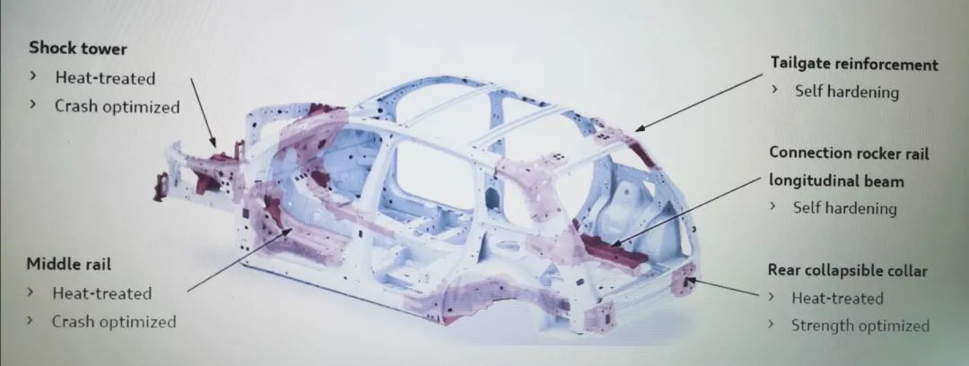 对,没错车身上足足使用十三件高压真空铝结构件,包括铝后纵梁左右,前置纵梁左右内外拼合,前减震塔左右,后减震塔左右,中央通道支架,门铰链板柱左右等。