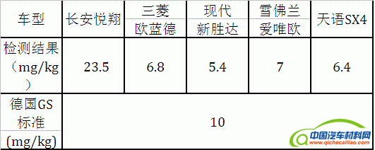如果根据德国GS标准,此次被点名的车型并非如报道所说的严重超标,除长安悦翔汽车被检出每公斤23.5毫克外,现代新胜达等车型的检测结果均无超出每公斤10毫克的标准。