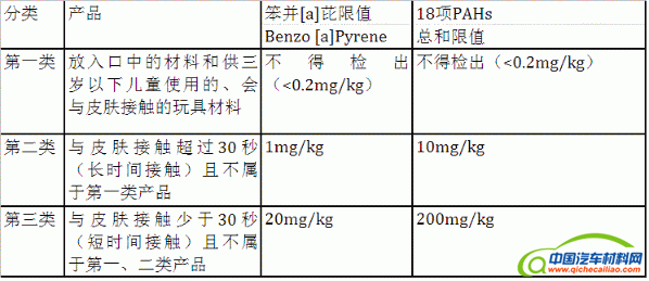 该标准中,产品按照是否放入口中或婴儿使用、与皮肤接触时长等特点分类,对各自的多环芳烃含量作出了限值要求。汽车方向盘、头枕等内饰属该标准中的第二类产品,即与皮肤接触超过30秒且不属于放入口中或婴儿使用的产品。该类产品的多环芳烃含量总和限值在每公斤10毫克以内。