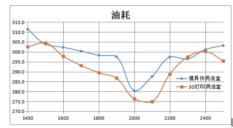 △ 同等条件下模具件涡流室与3D打印涡流室油耗对比