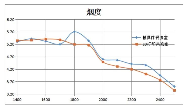 △ 同等条件下模具件涡流室与3D打印涡流室烟度对比