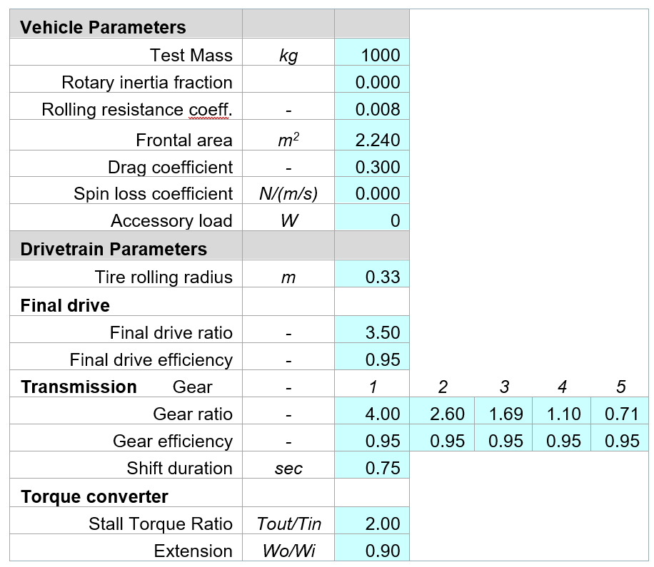 存在简单模型和复杂模型之间的一种折衷模型,我们称之为简约动力总成模型。简约是模型的基本原则,即最好的模型只需最少的假设,同时仍然能够提供准确的预测值。这些Excel电子表格模型涵盖了内燃机动力总成、纯电动汽车和插电式电动车,并且根据少量的输入数据预测燃料消耗和加速性能。模型输入包括车辆特性(质量、阻力系统、前部面积、滚动阻力),动力总成特性(燃料转换效率、传动比、齿轮传动系效率)和燃料消耗行驶周期。模型输出包括油耗、加速度和行驶地图。