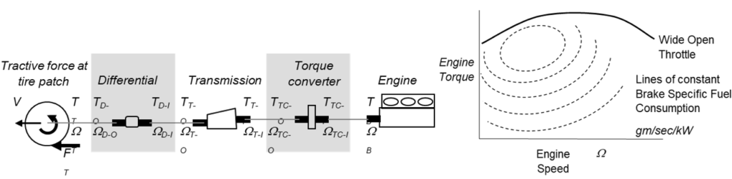 一旦知道了行驶周期中每个时间点的车速和牵引力,就可以为每个动力总成系统的元件确定所需的扭矩和转速,如图3为内燃系统,图4所示为纯电动汽车。