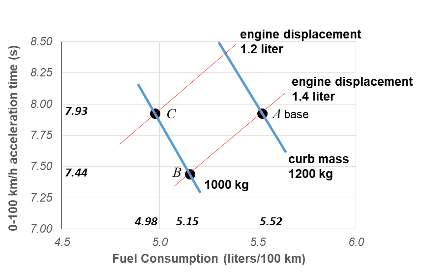 动力总成模型提供的结果总结,如图6加速时间和燃油消耗曲线图所示。A点是1200kg 整车质量的基本情况。B点是相同发动机条件下轻型(1000kg)车辆的基本情况。请注意油耗和加速时间降低。通常需要设置加速时间。对于较轻的车辆,可以减小发动机尺寸以获得原始的加速时间,从而进一步降低燃油消耗,如C点所示。