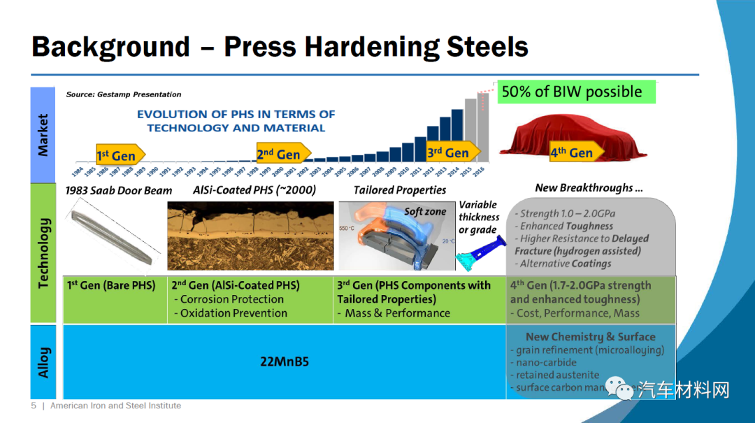 最常用的PHS等级是含硼的22MnB5,碳含量为0.22%(重量),良好的可弯曲性和极限拉伸强度约为1.5 GPa。在本次演讲中,工程师和设计师将听到GM正在研究的两种新型冲压硬化钢,并了解它们与商用22MnB5相比的性能。