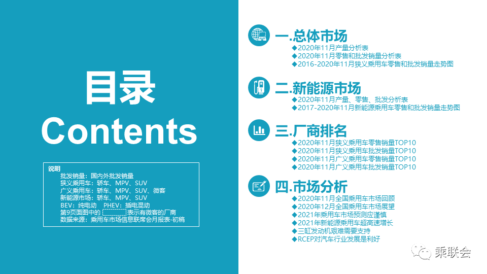 2020年中国车市呈现“V型”反转态势,2021年的车市将承接2020年的持续回暖趋势,增长势头较强。从1-11月乘联会产销数据走势预测,2020年乘用车批发零售增速都在-7%左右。考虑到2021年的不确定因素仍较大,因此大家对2021年走势普遍持乐观偏谨慎的态度。乘联会厂商预测团队11月初的预测判断是2021年狭义乘用车批发增速9%,零售增速7%,汽车增速4%。