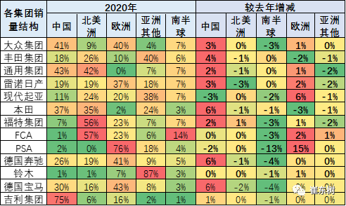 国际各大主力汽车集团在全球各地布局差异化,大众集团在中国和欧洲表现相对超强,而在北美南半球和其他亚洲国家表现相对偏弱,