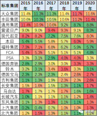 丰田集团表现相对较强,2020年在世界份额已经达到11.4%左右的水平,但大众的表现也持续上升。