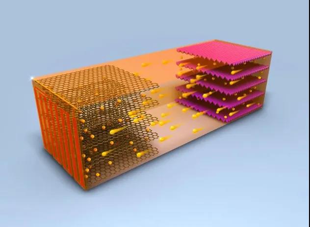 图一:锂电快充原理示意图。高温下充电速度会加快,其中金色小球代表锂离子。(图源:宾夕法尼亚州立大学)