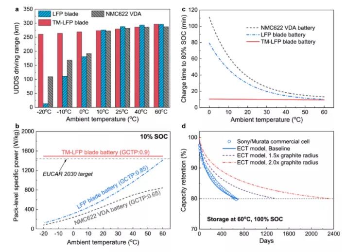 性能卖点二:全气候电池,实现250公里的高续航能力,百公里加速时间仅需3秒以内。基于团队前期的自加热电池结构,热调控电池每升温10℃大概消耗1.35%SOC,这意味着从-20℃加热至60℃需要消耗10.8% SOC。也就是说,即使在-20℃环境中热调控磷酸铁锂电池加热后只剩余89.2% SOC,仍然可以提供大于250公里的续航里程(图4a)。此外,该电池在-20℃, 10%SOC下的功率密度仍然达到~1500W/kg(图4b)。更重要的是,所组装的40kWh的电池包能够实现大于300kW的峰值功率,这意味着百公里加速时间可维持在3秒以内,超越了特斯拉!