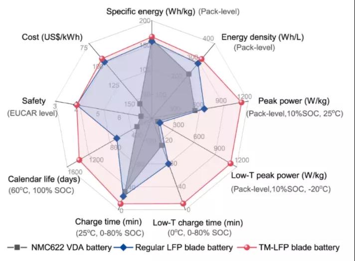 图5:热调控磷酸铁锂电池、传统三元电池、磷酸铁锂刀片电池的性能指标雷达图。