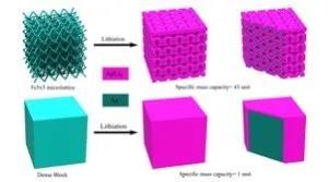 △3D打印的“多孔”电极可提高能量密度。可以将电极中的材料打印成三维晶格结果。晶格意味着电极具有更大的暴露表面积,增大化学反应面积,电池效率更高。另外,3D打印电池模块不需要多余的物质即可以实现一体化。想象一下,特斯拉85kWh电池组由7104个电池组成,将7104块电池粘合在一起的胶水和电线的重量相当大了。但是如果这些变成是增材制造过程的一部分,而不是多余的材料,能量密度将大大提高