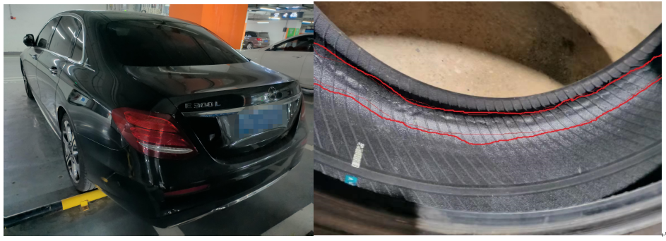 图为奔驰E300L,轮胎是倍耐力防爆胎,在轮胎扎胎的情况下继续行驶了30公里,轮胎内侧受到碾压产生裂纹。