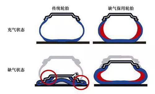 一般轮胎在失去轮胎压力的时候,轮胎在眨眼间就能像烂泥一样脱离轮毂,仅靠轮毂来与地面接触,易导致交通事故。而缺气保用轮胎与一般轮胎最大的不同就是在于它拥有非常好的韧性和支撑性的胎壁。这样的设计可以帮助轮胎在发生爆胎或者突然泄气的情况下,保证轮胎与轮毂还可以结合起来并给予车辆一定的支撑,从而保证车辆的安全。