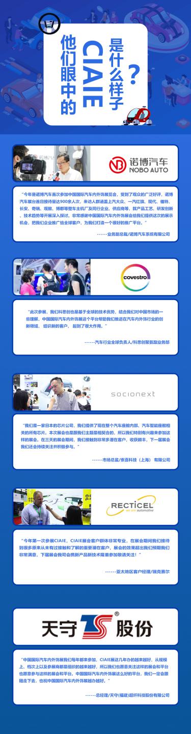 中国上海国际汽车内饰与外饰展览会(CIAIE)多年来伴随着中国汽车工业健康稳定的发展,展商数量持续增长,展品范围逐年丰富,涉及内外饰总成、座椅、智能驾驶舱、塑料件、装饰件、方向盘、门板、顶棚、车身覆盖件、车身结构件、外观件、座舱电子、被动安全、保险杠、后视镜、车灯与车辆照明等技术产品设计制造以及应用领域新材料、新技术、新设备、新工艺、新设备等相关产品全球品牌供应商集中亮相。