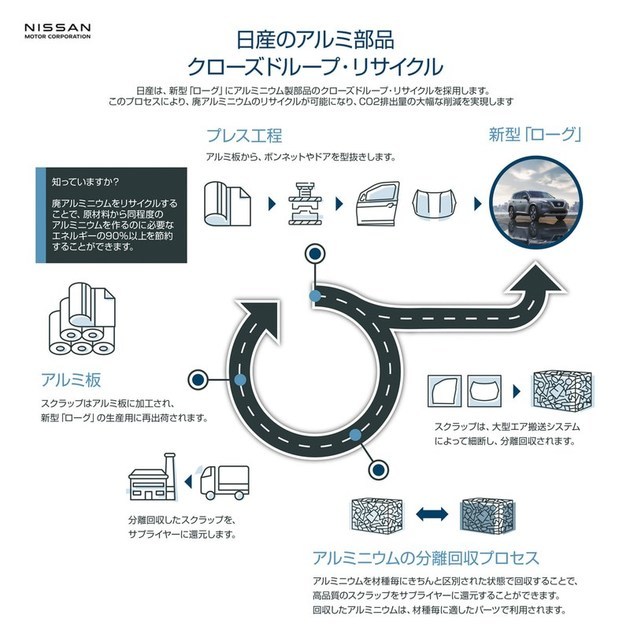 日产应对可持续性和轻量化挑战的方法之一,是为新款Rogue车型采用闭环铝回收系统。闭环系统的核心,是大型气力输送系统。引擎盖和车门经冲压成型,废铝被粉碎后,按不同的铝品级分离。这种分离确保了日产能够将高质量的废铝返还给供应商。供应商使用分离和再加工的废铝制造铝合金板,并将其重新交付给日产用于生产汽车零部件。