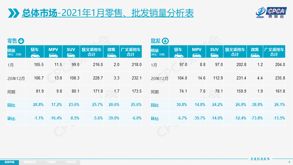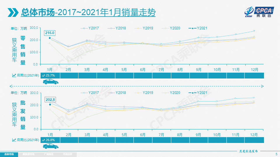 零售:1月乘用车市场零售达到216.0万辆,环比12月下降5.6%,同比去年1月增长25.7%,实现了2021年的开门红。