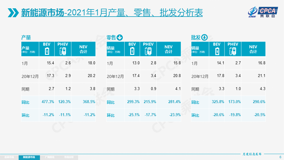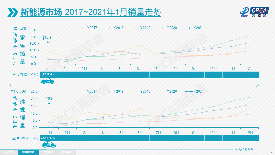 2017年和2018年的新能源车市场与传统车市场走势有巨大的差异性,2017年和2018年新能源车市场都呈现年度内持续、单边的快速上扬的态势。2019年,新能源车市场呈现前高后低的走势特征。到2020年的新能源车市场又呈现出疫情之后的巨大“V型”反转态势,形成了下半年以来超强的走势特征。2020年末乘联会新能源乘用车销量统计达到20万的超强峰值。随着2021年初新的补贴政策实施,按照历年补贴变化规律则应该是1月出现巨大的销量环比下降。但实际的环比下降幅度仅有20%。这体现新能源乘用车从政策驱动到市场化拉动转换的效果良好。
