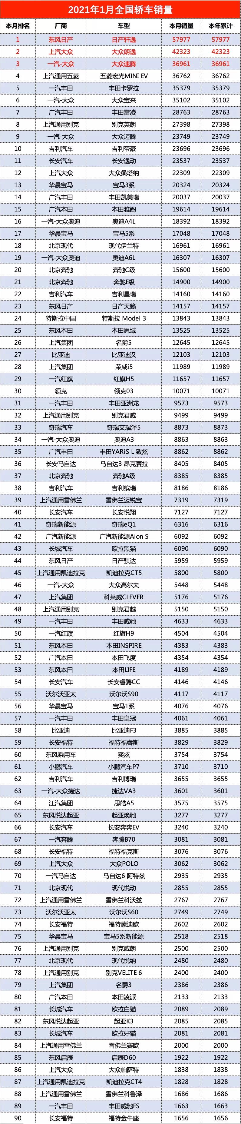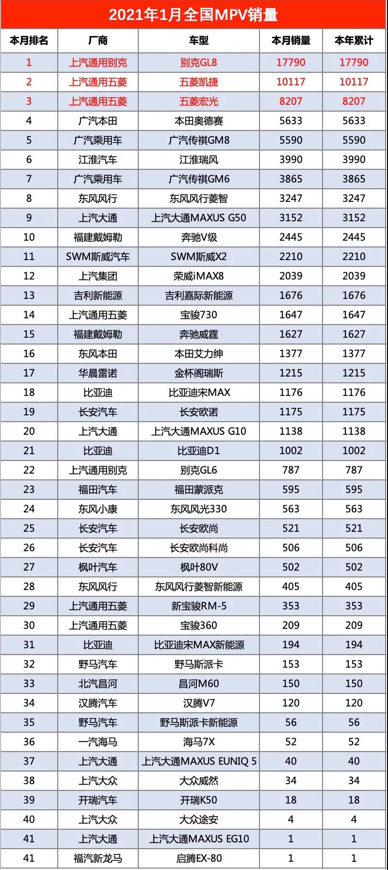 2021年1月MPV销量总榜:1.别克GL8 17790辆;2.五菱凯捷 10117辆;3.五菱宏光 8207辆;4.本田奥德赛 5633辆;5.广汽传祺GM8 5590辆;6.江淮瑞风 3990辆;7.广汽传祺GM6 3865辆;8.东风风行菱智 3247辆;9.上汽大通MAXUS G50 3152辆;10.奔驰V级 2445辆。