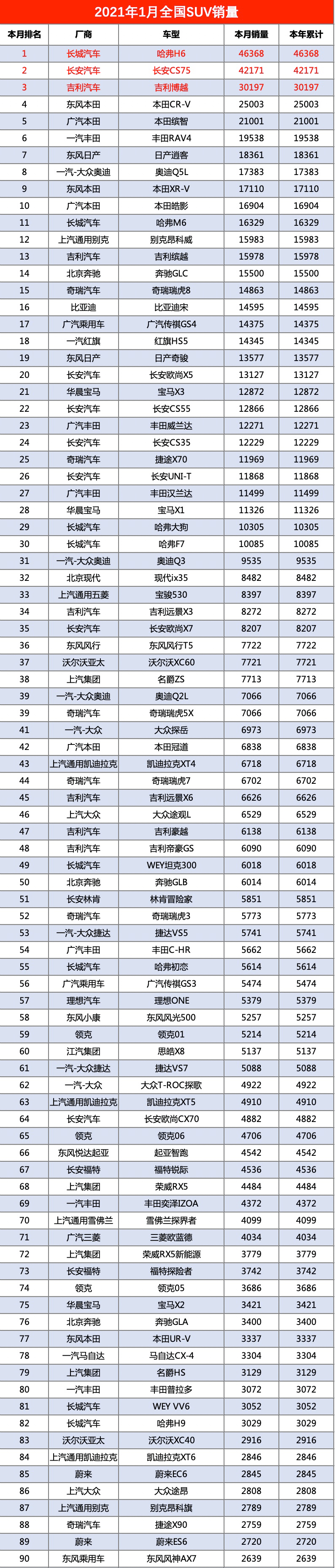 2021年1月SUV销量总榜:1.哈弗H6 46368辆;2.长安CS75 42171辆;3.吉利博越 30197辆;4.本田CR-V 25003辆;5.本田缤智 21001辆;6.丰田RAV4 19538辆;7.日产逍客 18361辆;8.奥迪Q5L 17383辆;9.本田XR-V 17110辆;10.本田皓影 16904辆。