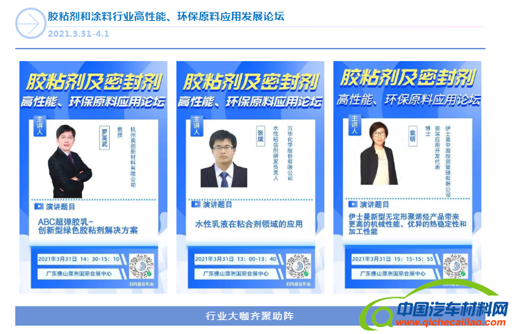 2021年3月31-4月2日,作为中国最具规模和影响力之一的胶粘品牌盛会——大湾区国际胶粘剂及密封剂展(China Adhesive GBA)将在广东佛山潭洲国际会展中心隆重举办,将汇集近400余家专业胶粘剂厂家,现场为您定制化解决车用胶难题,为华南汽车产业呈现全新绿色粘接、密封、修补解决方案,助力汽车行业绿色轻量化、高性能发展!