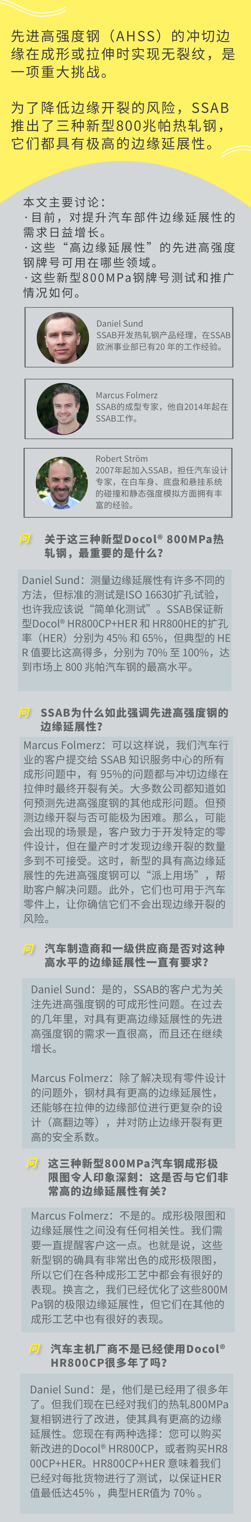 (AHSS)的冲切边缘再成形或拉伸时实现无裂纹,是一项重大挑战。为了降低边缘开裂的风险,SSAB推出了三种新型800兆帕热轧钢,它们都具有极高的边缘延展性。