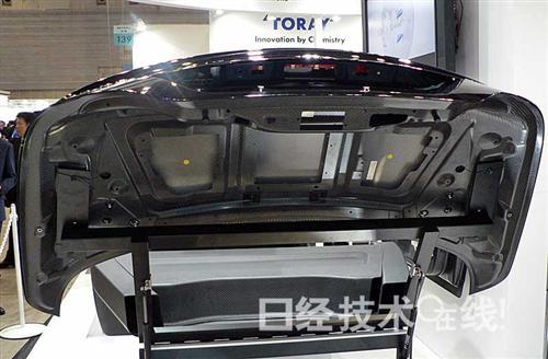 此次东丽展示的是后备箱盖内侧部件,通过粘合技术与外侧的GFRP(玻璃纤维增强树脂基复合材料)接合在一起。据东丽介绍,只有内侧部件采用CFRP是因为,这样就已达到了后备箱盖的轻量化目标,没有必要再花费用连外板都改用CFRP。